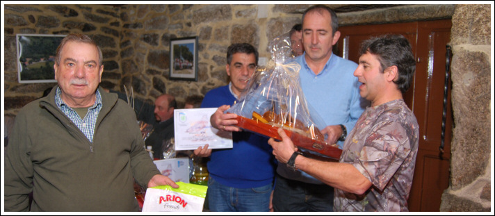 Trofeos e distincións foron entregadas o remate dun xantar de irmandade no que asistiron: Xavier Nogueira, Presidente da Federación Autonómica de Caza; Pablo Caballero, Xefe da Sección de Caza e Pesca da Xunta en Pontevedra; José Marante, Comandante do Posto da Garda Civil de Ponte Caldelas; José Manuel Carballal, Presidente da Sociedade “Monte Seixido” e, comandando todo o cotarro, o Presidente federativo provincial, Paco Couselo, quen contou coa valiosa colaboración do seu Vicepresidente provincial, Alejandro Lorenzo Carregal.