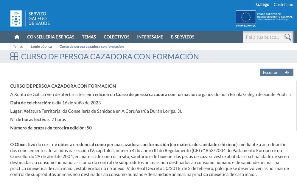 Despois da celebración das edicións de Santiago, Lugo e Pontevedra as Consellerías de Medio Ambiente, Territorio e Vivienda; Medio Rural; e Sanidade, en colaboración coa Federación Galega de Caza, ofertan a cuarta edición do curso de persoa cazadora con formación, organizado pola Escola Galega de Saúde Pública, que se celebrará o día 16 de xuño de 2023 na Xefatura Territorial da Consellería de Sanidade na Coruña (rúa Durán Loriga, 3).